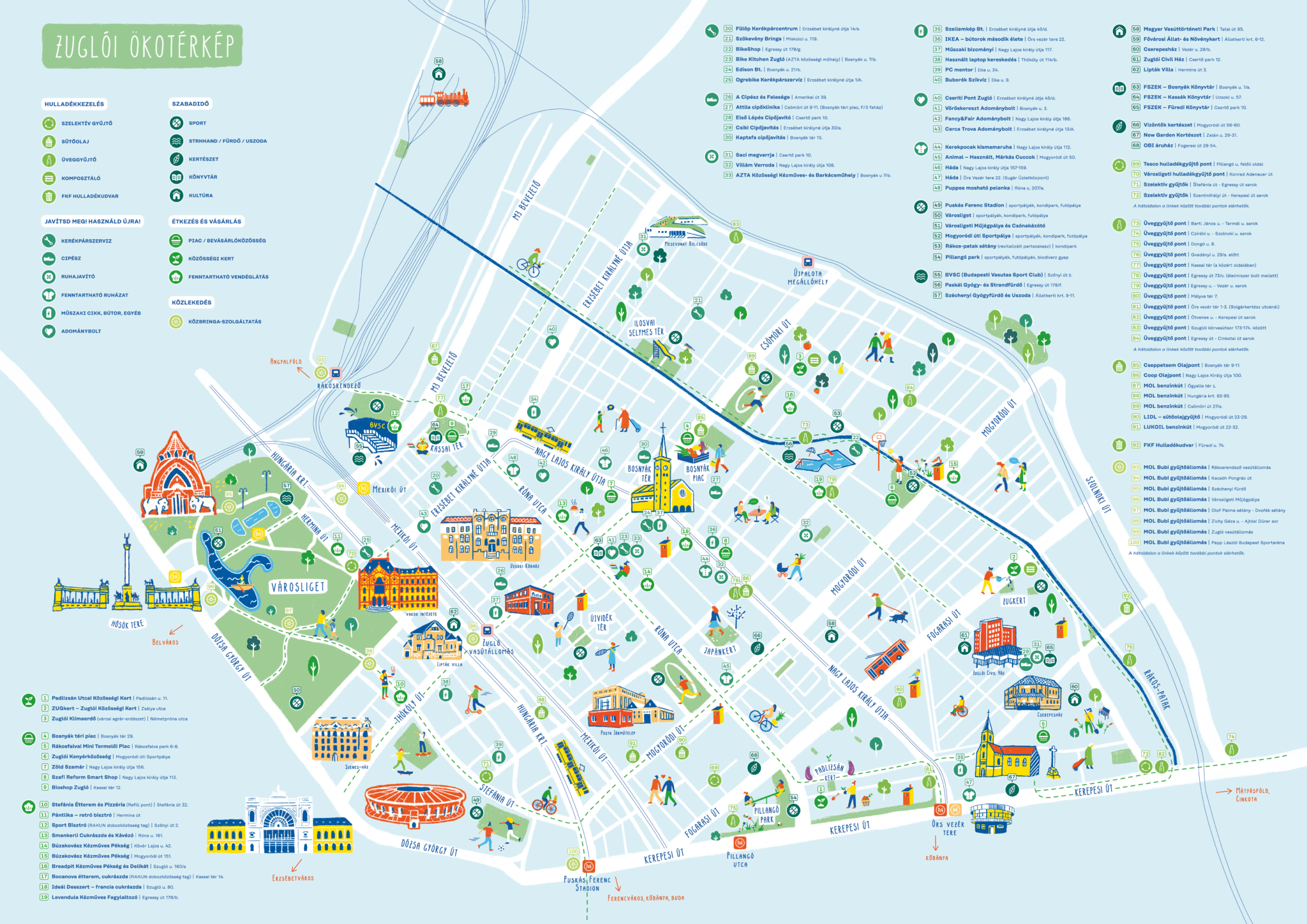 2022 óta a Zuglói Ökotérkép egy olyan hasznos kalauzként szolgál, amely támogatja a lakosokat a zöld életmódra való átállásban. Legyen szó akár kerékpár javításról, egy megbízható cipész megtalálásáról, vagy épp arról, hogy hol találhattok egészséges és környezettudatos étkezési lehetőségeket a kerületben.