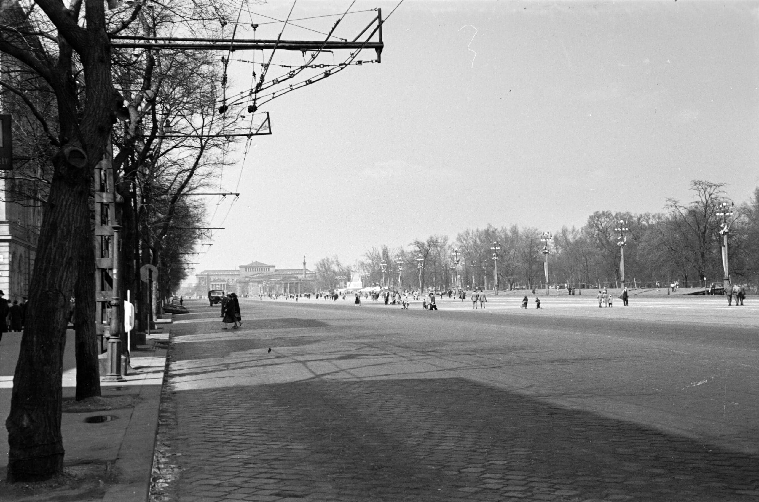 Egy 1960-as felvétel, amin a Dózsa György út az István (Landler Jenő) utca felől a Felvonulási tér és a Hősök tere felé látható.